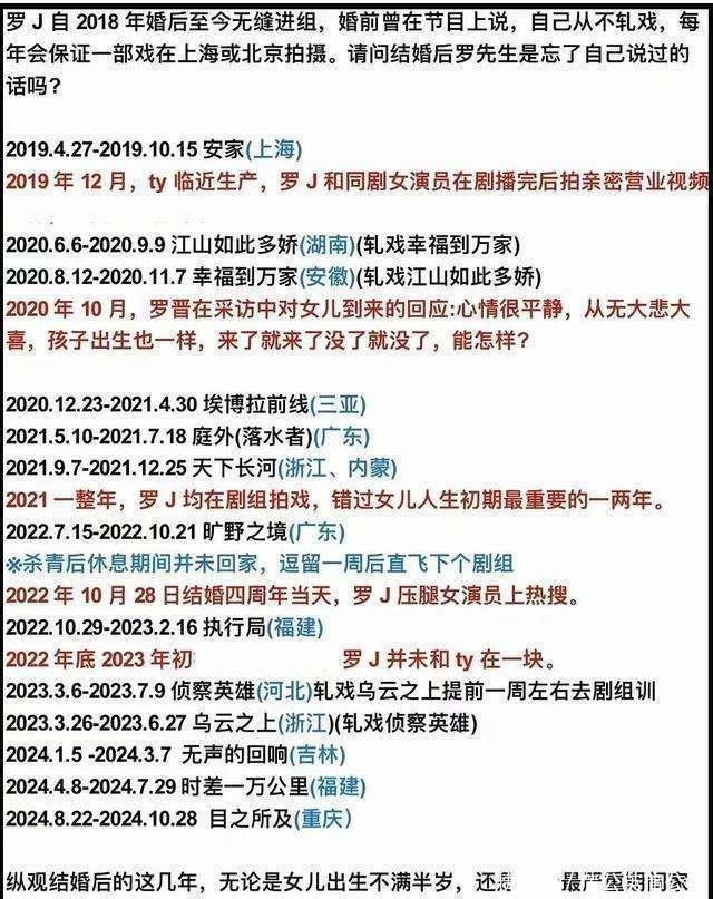 仔细一看,唐嫣和罗晋的关系似乎并不像外界想象的那么紧密。粉丝整理了一下两人的行程表,发现红色标记的罗晋通告几乎填满了整张表,而唐嫣的行程则明显空闲了很多,且两人共度的时间屈指可数。罗晋几乎忙到无法喘息,拍戏、彩排、活动应接不暇,而唐嫣则更多时间待在上海,陪伴父母和女儿。尤其是在唐嫣怀孕时,罗晋几乎一直在外拍戏,直到唐嫣临产前两周才赶回一趟。这种种“缺席”令人不停猜测,罗晋是否真的“疏于家庭”。