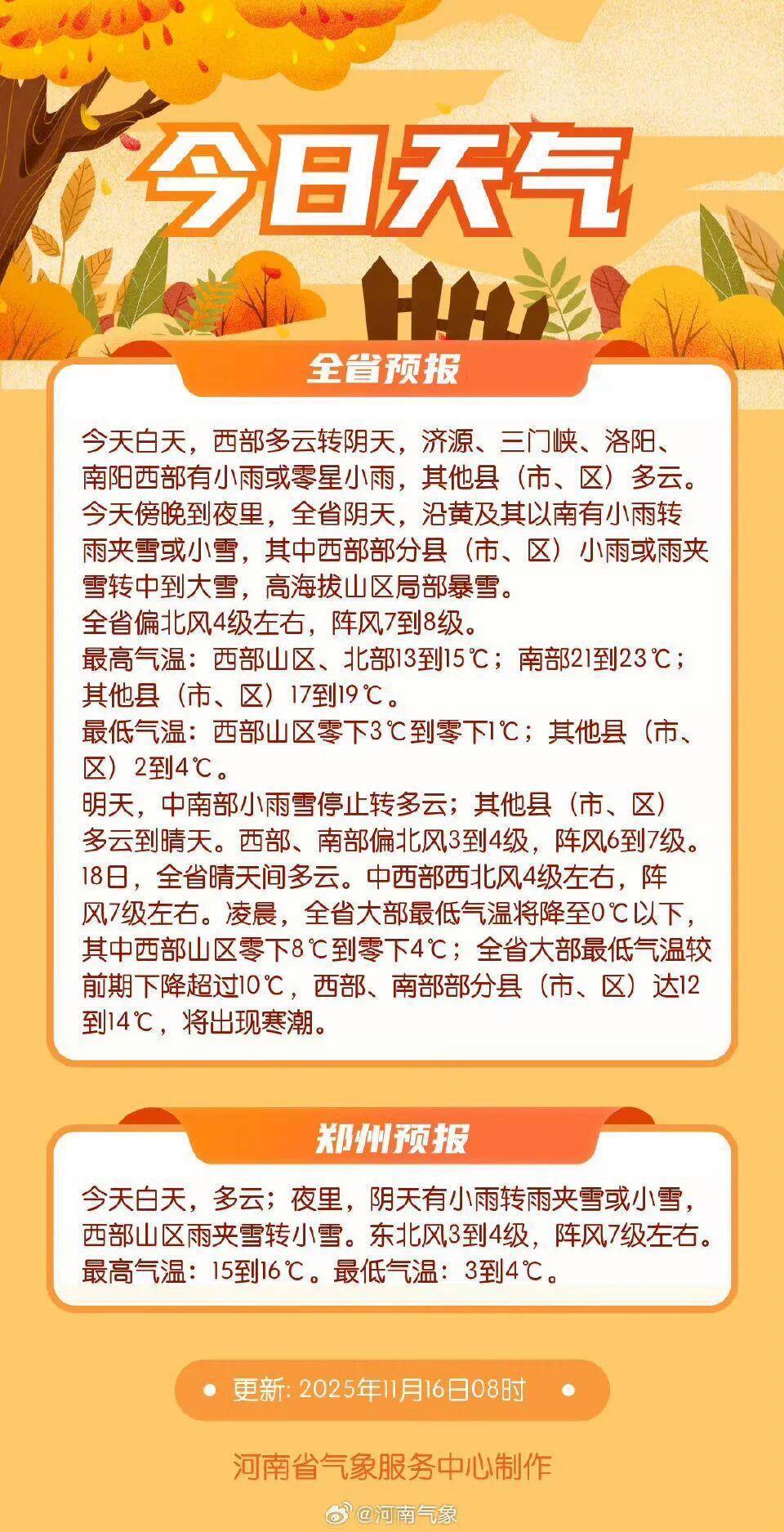 随着大风把寒冷的空气不断向河南输送,今天傍晚到夜里,沿黄及以南地区有小雨转雨夹雪或小雪,西部部分地区有中到大雪,高海拔山区局部暴雪。17日中南部雨雪渐停。今天至18日全省风力强劲,偏北风4级左右,阵风7-8级,请注意防范。17-18日凌晨气温骤降,全省大部最低气温将跌破0℃,西部山区低至-8℃到-4℃。大部分地区降温幅度超过10℃,西部、南部局地达12-14℃,寒潮来势汹汹!