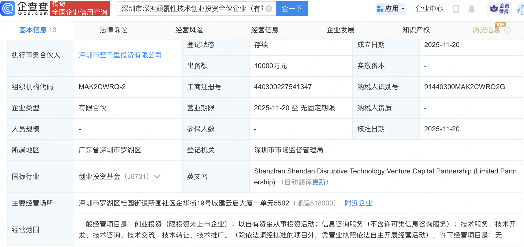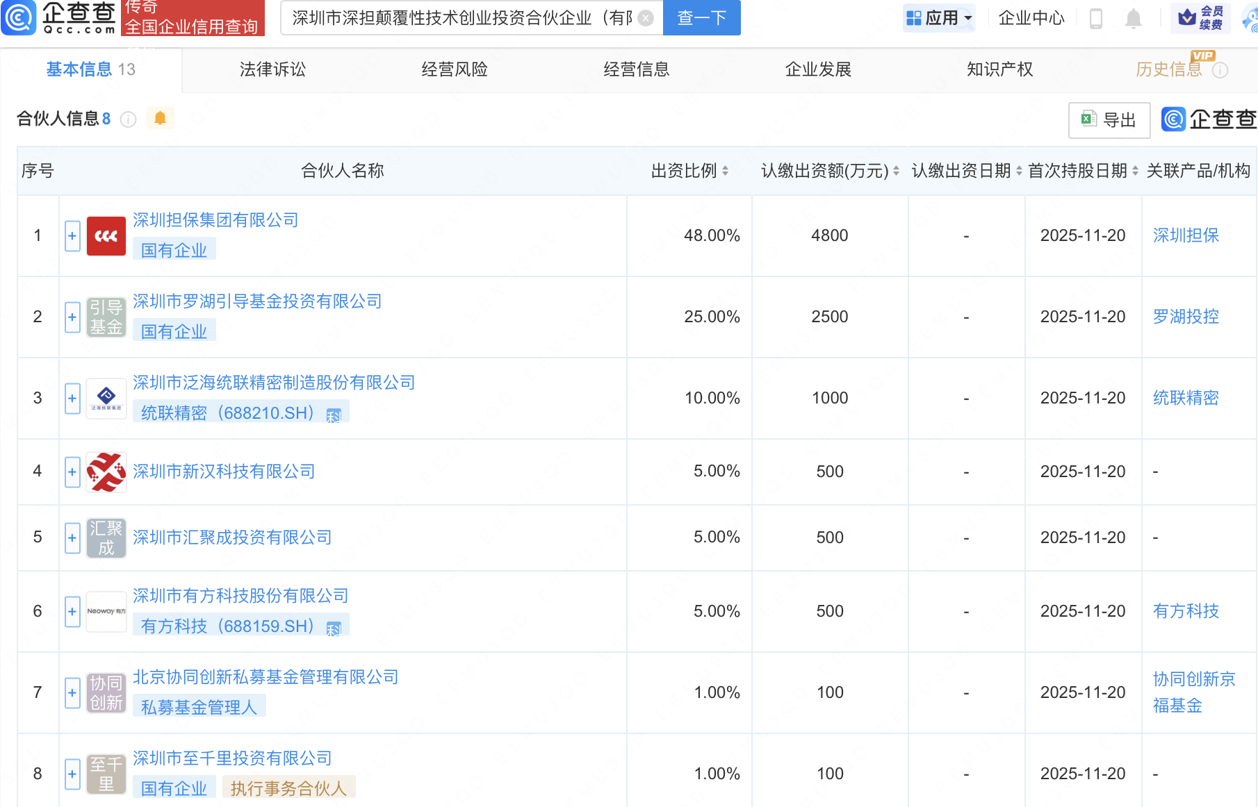 近日股票配资盘,深圳市深担颠覆性技术创业投资合伙企业(有限合伙)成立,出资额1亿元,经营范围包含:以自有资金从事投资活动;信息咨询服务(不含许可类信息咨询服务)等。企查查股权穿透显示,该企业由统联精密(688210)、有方科技(688159)等共同出资。