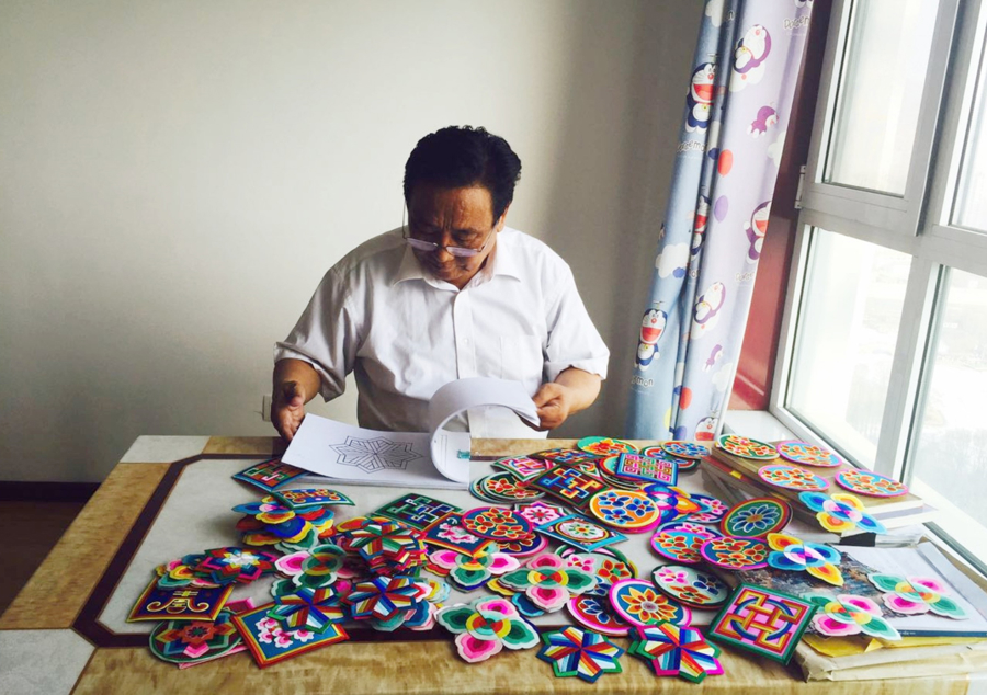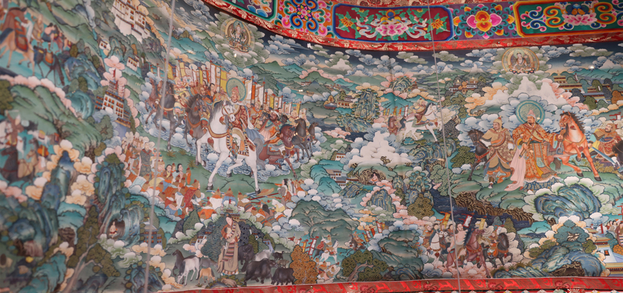 在当地政府支持下,宗者拉杰还组建了专业工作小组,更广泛地搜集资料。“那时,家里添了一辆二手车,爸爸越跑越远,哥哥也成了他的助手。”多杰吉告诉记者,父亲在筹备和创作《彩绘大观》的27年里,前前后后走了将近20万公里路,调查考证的足迹遍及整个藏区。1996年5月,《彩绘大观》的绘制在青海省黄南州正式启动,宗者拉杰组织约400位专家、学者、工艺美术师,共同绘制了近4年。他与专家沟通研讨,调整画卷内容,将上卷的篇幅扩展到618米,拓展其历史跨度和涵盖内容。