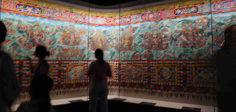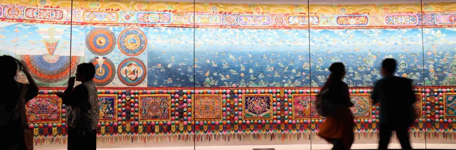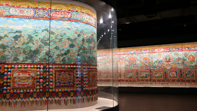 作为青海藏文化博物院(青海藏医药文化博物馆)的“镇馆之宝”,《中国藏族文化艺术彩绘大观》(以下简称《彩绘大观》)分上下两卷,总长1028米。它系统展现藏族的历史、宗教、文化、艺术、医药、天文、地理、习俗及各民族团结共荣等内容,融思想性、艺术性、观赏性于一体,被誉为藏族文化艺术的“百科全图”。