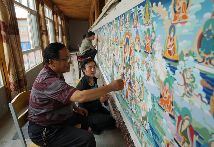 宗者拉杰指导青年画师绘制《彩绘大观》下部。