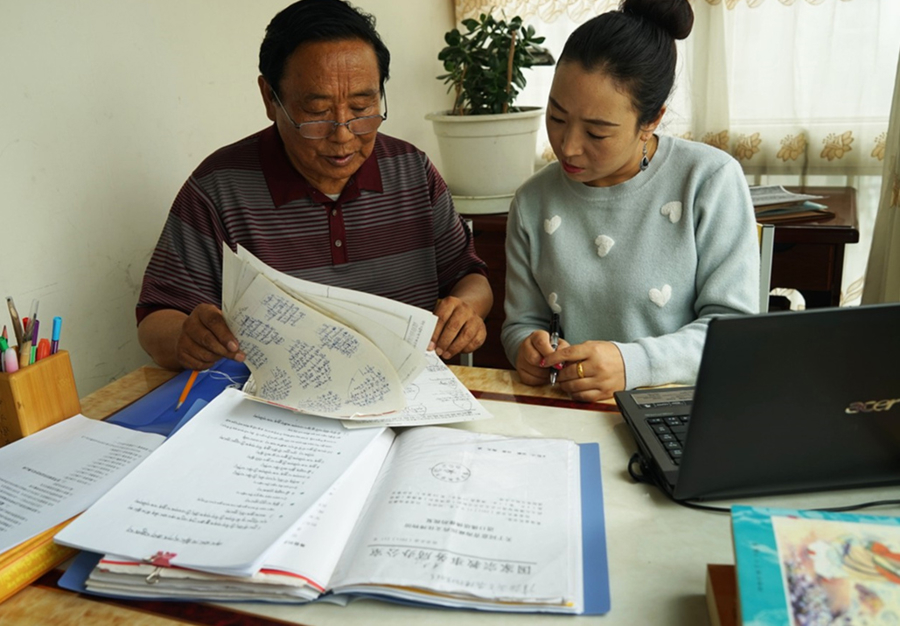 宗者拉杰向女儿多杰吉传授《彩绘大观》资料。